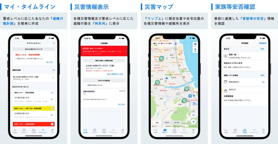 自治体からは、避難所状態、避難情報発令等を市民に届けることができます。市民はスマートフォン上のアプリから、災害時の避難行動をあらかじめ計画するマイ・タイムライン注1の作成、現在位置や自宅位置に基づいた周辺の災害情報の確認、および、事前に登録した家族等の安否情報の共有が可能となります。