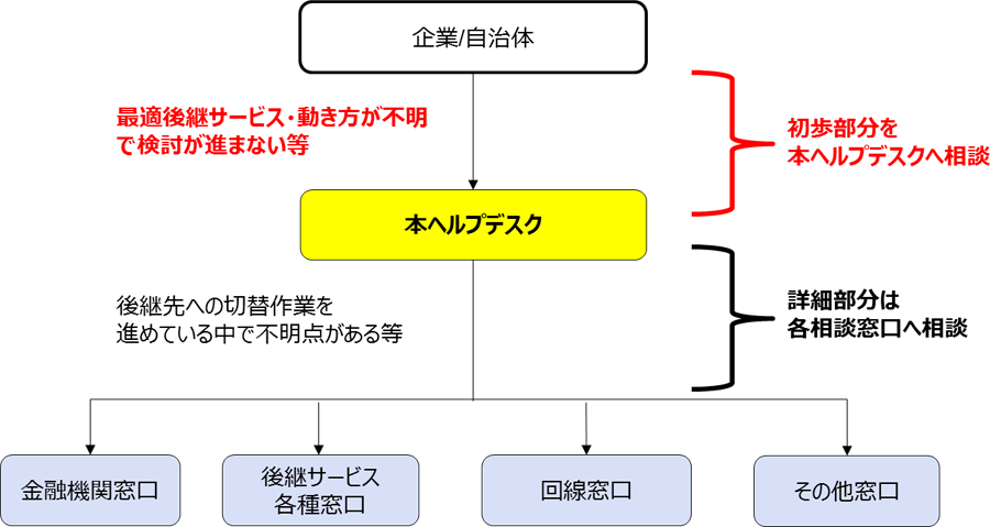 NTTデータでは本ヘルプデスクの他にも各後継サービスにおいて、企業・自治体向けの相談窓口を設置しています。問い合わせ窓口の一覧については「eBサービスNAVI」(トップページ | eBサービスNAVI(eb-transformation.com))を参照のうえ、質問内容に沿った窓口へお問い合わせください。