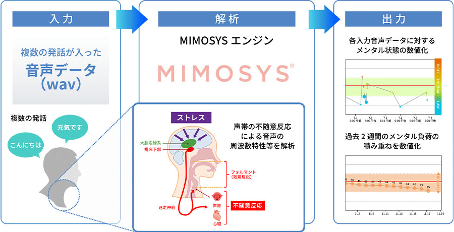 無自覚で行われる声帯の不随意反応に着目し、声の周波数の変動パターン等から心状態を分析し可視化します。本人も気づきにくい声の状態を可視化する音声解析エンジンを搭載し、声帯の不随意反応による音声の周波数特性等を短時間で解析することができます。これにより、従業員の高ストレス状態に早期に気づくことができ、適切なケアを行うことで業務の生産性低下や休職などの状態へ陥ることを防ぎます。