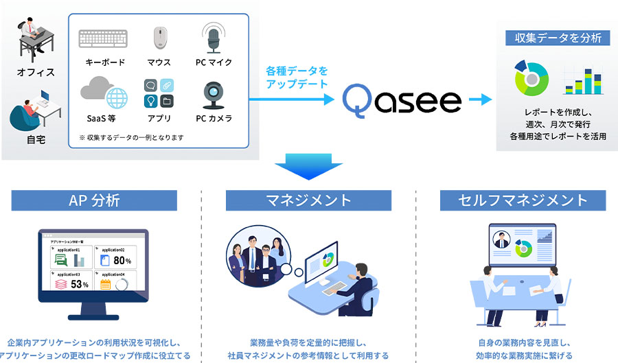 Qaseeは、従業員が業務中に操作したキーボードやマウス、利用したAP等のデータを収集し、可視化することが可能です。また、収集したデータから自身の業務状況が可視化され、さらに業務状況に関する分析レポートが出力されます。これらのレポートを活用することで自身の業務内容を見直し、効率的な業務に繋げることができます。