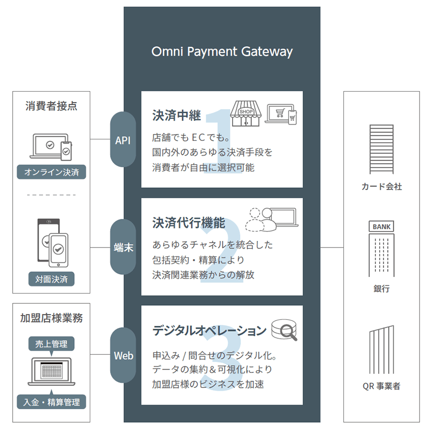対面・オンライン双方のチャネルを統合した包括契約・精算を実施。精算は業態特性に応じた方式を実現します。