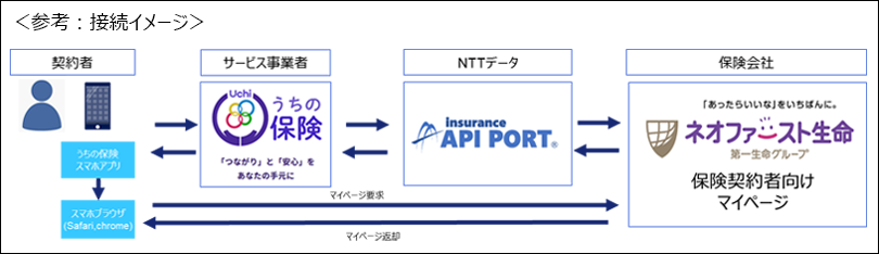本サービスとNTTデータが提供する保険業界向け標準API仕様の利活用によって、「うちの保険」からネオファースト生命の保険契約者向けマイページへセキュアかつシームレスな遷移を可能とします。保険契約者はマイページへの遷移に際し二回目以降ID/PWの入力を行うことなく、当該アプリ内でリアルタイムに最新の契約情報を参照することができます。