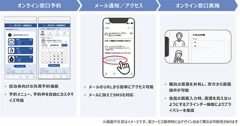 住民はパソコンやスマートフォンからWebサイトを通じてオンライン窓口の予約を行い、予約後に届くメールから簡単にオンライン窓口に接続することができます。専用アプリ等のインストールは不要で、URLをクリックするだけでつなぐことができるため、ITツールに不慣れな住民でも簡単に利用することができます。オンライン窓口では、自治体職員とビデオ通話ができるだけでなく、自治体職員が画面を共有し、その画面を双方で操作することもできるため、住民は画面上で不明点を会話・確認しながら一緒に手続きを進めることができます。