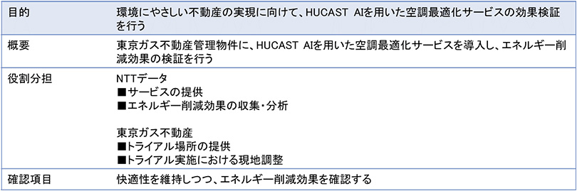 株式会社NTTデータ(本社:東京都江東区、代表取締役社長:佐々木 裕、以下:NTTデータ)は東京ガス不動産株式会社(本社:東京都港区、代表取締役社長執行役員:穴水 孝、以下:東京ガス不動産)が管理する物件において、HUCAST™ AIを用いた空調最適化サービスの有償トライアルを行います。