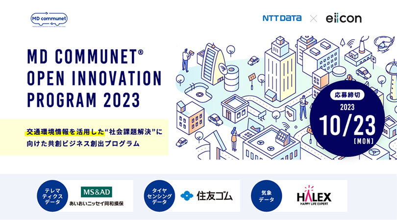 株式会社NTTデータ(以下、NTTデータ)は、2023年9月13日より株式会社eiicon(以下、eiicon)とともに交通環境情報を活用した“社会課題解決”に向けた共創ビジネス創出プログラム「MD communet® OPEN INNOVATION PROGRAM 2023(以下「本プログラム」)」を始動します。さらに同日より、「MD communet注1」の会員である、あいおいニッセイ同和損害保険株式会社(以下「あいおいニッセイ同和損保」)、住友ゴム工業株式会社(以下「住友ゴム工業」)、株式会社ハレックス(以下「ハレックス」)の3社(以下、中核企業)が掲げるテーマ課題を解決するアイデアを持つ共創パートナーの募集を開始しました。