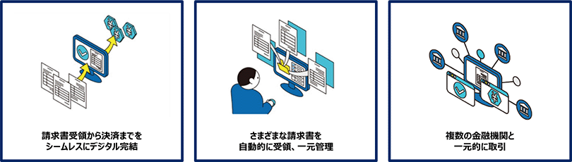 また、様々な業界のサプライチェーンとともに、請求データ等を活用したサプライチェーンファイナンス、データドリブン経営支援等の新しいサービスの創出に取り組み、サプライチェーン全体の生産性向上や競争力強化、DX等を通じたサプライチェーンの強靭化を目指します。