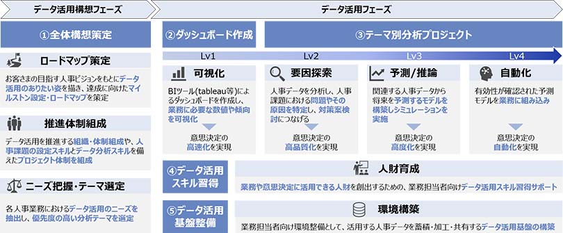 これまで長年培ってきた「データ活用ノウハウ」と、社内における「People Analytics」の実績を活用し、人事領域におけるデータ活用の全体構想から、ダッシュボート作成やテーマ別分析プロジェクトなどのデータ活用サービスを提供します。そのほか、業務担当者の「データ活用スキルの習得サポート」や「データ活用基盤の整備」など、人事課題に合わせて全方位的に支援します。
