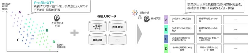 NTTデータでは、本サービスの社外提供に先駆け、社内にて新卒適正配置や女性活躍推進、デジタル人財強化に向けた事業創出人財育成といった人事領域におけるデータドリブン経営を推進しています。例えば事業創出人財育成において、資質アセスメント(適性診断)の結果データに各種人事データを掛け合わせ、事業創出人財のタイプを複数分類し、人財タイプごとに親和性の高い経験・経歴を機械学習モデルによって算定します。人財タイプ別の育成レシピとして策定することで、事業創出人財の育成・増強に対して効果的・効率的な方法を、客観的な手法で明らかにしました。