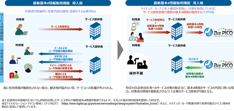 BizPICOでは公的個人認証サービス注1を用いたマイナンバーカードによるオンライン本人確認を中心としたサービス展開をしています。今回提供するのは、公的個人認証サービスを用いて本人確認を実施した利用者の基本4情報に異動が発生した際、事前の本人同意に基づき本人確認実施事業者・行政機関(以下、「サービス提供者」)に最新情報を提供するサービスです。サービス提供者は、利用者の基本4情報に変更が生じた場合、本人からの変更届出なしに利用者情報を最新化できるようになります。これにより、サービス提供者は各利用者に最新情報確認のためのメール、はがき送付が不要となり、郵送物の不届きを減らします。また、住所情報に基づいたサービス等、正確な基本4情報を必要とするサービス提供の価値向上にも寄与します。
