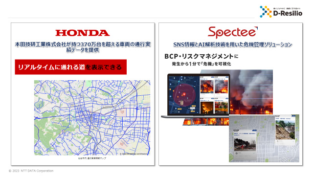 株式会社NTTデータ(以下、NTTデータ)は、ハイレジリエント社会を実現するコラボレーションプラットフォーム「D-Resilio連携基盤™注1」の新コンテンツとして、今秋、「道路通行実績情報」(本田技研工業株式会社提供)と「SNS情報」(株式会社Spectee提供)を追加しました。