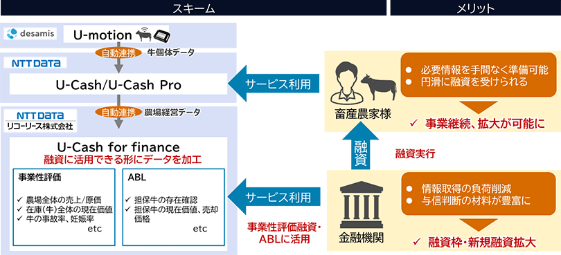 そこで、NTTデータは、これらの課題を解決するために、デザミス、リコーリースとともに、IoTデータを活用し、牛の価値や経営状況をリアルタイムで評価する新たなサービス「U-Cash for Finance」を金融機関へ提供し、畜産業界のデジタルトランスフォーメーション(DX)を支援します。