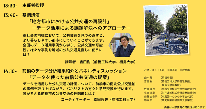 人材育成を加速させる取り組みの第一弾として2023年12月16日に前橋工科大学にて無料公開シンポジウム「データ活用で切り開く 公共交通の新境地」を開催します。