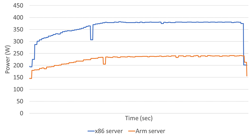 図2:実行時における従来型サーバーとArmサーバーの消費電力比較