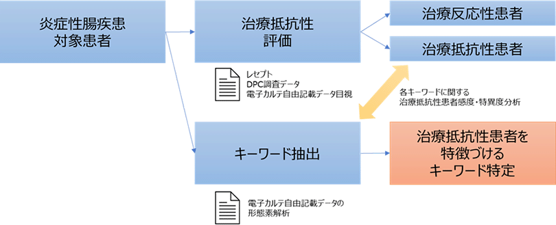 | 研究手法 | 千年カルテに登録されているIBD患者866名のうち、患者データの経過記録などから研究対象治療薬の投与履歴が確認された210名を対象に、薬物の治療抵抗性の有無について経過記録および臨床サマリー情報の自由記載データを目視確認し治療抵抗性有無に関する判定を行った。 経過記録および臨床サマリー情報の自由記載データに対し、類義語登録、態度表現(肯定・否定)の区別を行いながら自然言語処理技術を適用し、薬物治療抵抗性の判定に有用と思われるキーワードを特定した。その上で、薬物治療抵抗性判定に対するキーワードの精度を評価した。 |
