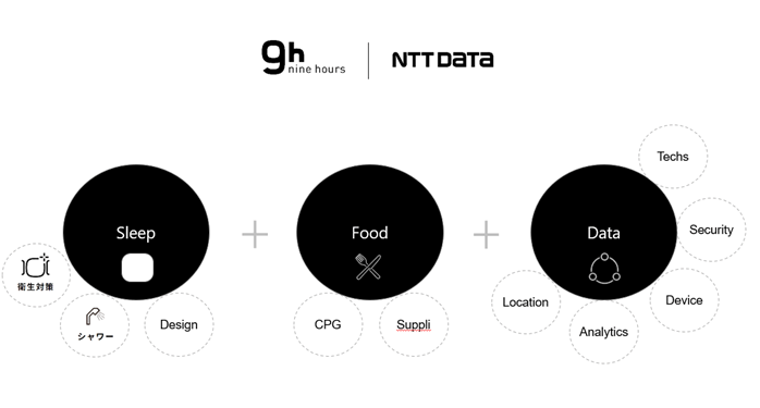 カプセルホテルを運営するナインアワーズの睡眠解析サービス「9h sleep fitscan」は、カプセルの形状を生かし、赤外線カメラ・集音マイク・体動センサーを使って、同意を得た利用者の宿泊中の睡眠データを収集、解析するものです。NTTデータとナインアワーズは、生活者が無意識のうちに、パーソナルデータの取得・活用ができる世界の実現に向けた第一歩として、現在、Sleep Lab事業(睡眠解析+カプセルホテル)を企画しており、生活者の1日の約1/3を占める睡眠に関する課題解決に貢献します。