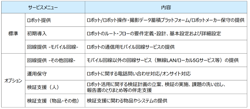 無線LAN、ローカル5Gなどモバイル回線以外の回線提供、ロボットのメーカー保守外の運用保守支援、ロボットの活用範囲を広げたい場合の検証支援サービスを提供します。回線サービスは、ネットワーク設計から保守まで一貫して提供します。