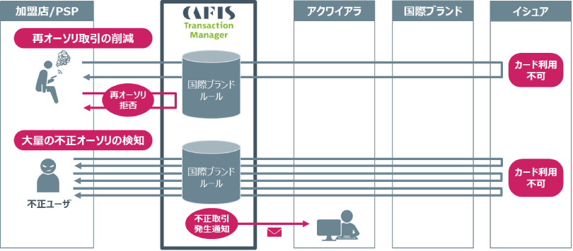 CCTMの新機能は、加盟店が国際ブランドのルールを逸脱した再オーソリを実施した際に、アクワイアラの代わりにCAFISが拒否応答をするものです。また、大量の不正オーソリをCCTMが検知した場合、アクワイアラに通知するため、CCTMの新機能を従来の機能と組み合わせて利用することで、効果的に不正対策を行うことができます。