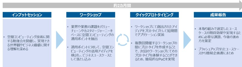 具体的な取り組み内容は、主に「インプットセッション」、「ワークショップ」、「クイックプロトタイピング」の3つから構成されます。最終的な成果報告として、ブラッシュアップされたユースケースの実現に向け、ロードマップ・企画書を作成する想定です。期間は約2カ月間の予定です。