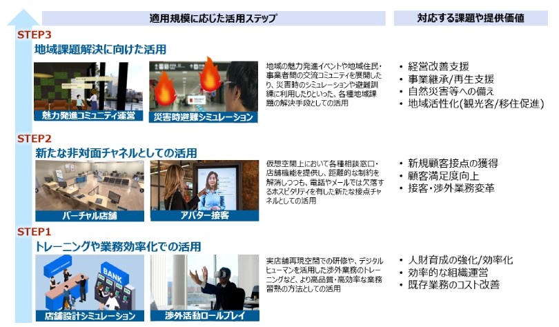 本取り組みは、島田掛川信用金庫が信用金庫業界・信用金庫業務の知見を提供し、NTTデータはこれまで研究開発を進めてきたメタバースやAR・VRなど空間コンピューティングに関する技術・ノウハウを提供します。両社の知見・アセットを掛け合わせることで、信用金庫ビジネスの変革や信用金庫業界が目指す地域課題解決を実現するユースケース創出を検討します。