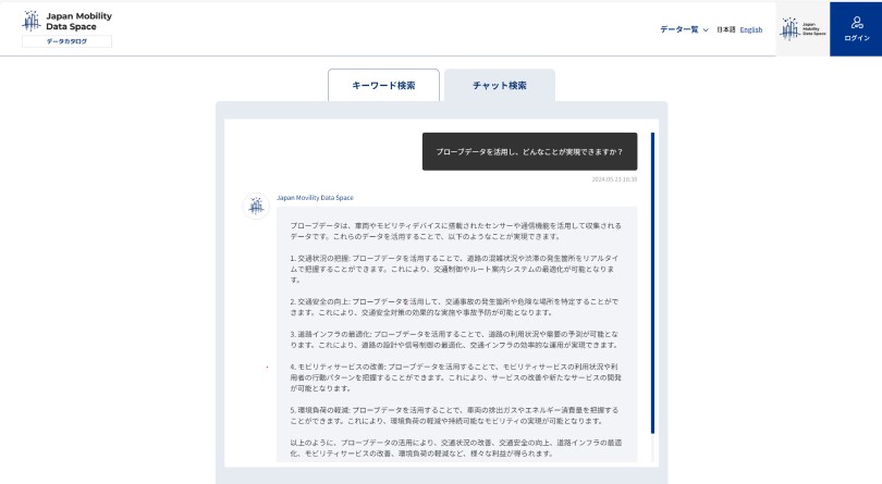 統合データカタログサービスは、Japan Mobility Data Spaceに登録されているデータカタログ全体を横断的に検索できるサービスです。また、通常のキーワード検索に加え、生成AIにより、対話形式で欲しい情報を検索することも可能です。データ提供者は保有データをカタログに登録することで、通常の営業活動では出会えない事業者からの引き合いを期待することができます。また、データ利用者は新たなサービス創出を検討するにあたり、必要となるデータや技術を持つ事業者を検索することが可能となります。