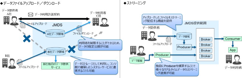 データ格納サービスは、自社でデータの保有ができない、保有するデータを提供する環境がないデータホルダーに対し、第三者へのデータ提供を可能とするサービスです。静的ファイル(データファイルのアップロード/ダウンロード)と動的ファイル(ストリーミング)の利用が可能です。本サービスを活用することで、データの公開、提供が可能となり、新たなドメイン開拓や交流を期待することができます。