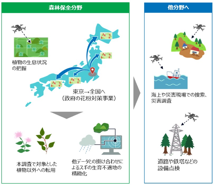 現在、人力・手作業で行っている本調査をドローンで代替することにより、調査エリアの拡大、調査効率の向上、調査員の安全確保などに大きく貢献するものと期待されます。