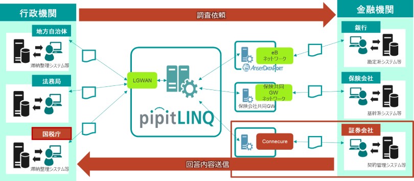 また、すでにpipitLINQ®を利用している行政機関においては、新たなシステムを導入することなく、pipitLINQ®を導入した証券会社に対する取引照会業務のデジタル化が可能となります。