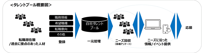 タレントプールとは、NTTデータグループに興味のある転職潜在層や、これまでの採用活動等で接点のあった人財を、自社独自の人財プールで一元管理するものです。中長期的に登録者のニーズを踏まえた会社や求人、技術テーマに沿った独自イベント等の情報を、直接かつタイムリーに提供し、自社への興味関心を醸成しながら、中長期的に採用へつなげます。