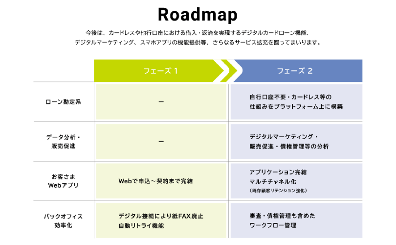 アプリ機能の提供、カードレスや他行口座における借入・返済を実現するデジタルカードローン機能、デジタルマーケティング等、追加機能・サービスの提供に向け機能を拡張していきます。