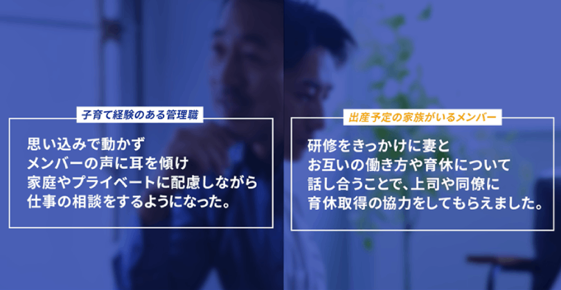 パートナー間だけでなく社員や同僚等会社の方たちと育休取得に対する目線合わせを行うことで、スムーズな育休取得を実現するとともに、当事者が取得後も育児をしながら満足のいくキャリアや人生を実現することをめざしています。