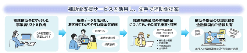 金融機関の担当者が企業に対して補助金活用の提案をする際の営業支援機能です。