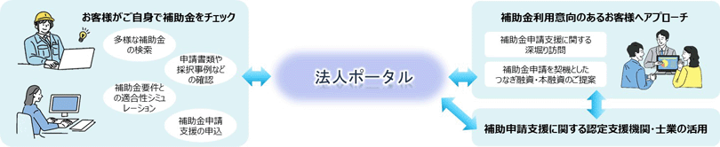 法人ポータル経由で企業が多様な補助金の検索注2、補助金要件との適合性シミュレーションおよび金融機関に対する補助金申請支援の申し込みを行うことが可能です。金融機関職員は、企業からの補助金申請支援の申し込みを契機に、補助金利用意向のある企業へアプローチすることにより、効果的・効率的に補助金提案を推進できます。また、多様な補助金・助成金の申請支援に向けて、外部コンサルタント(認定支援機関・士業)注2につなぐことも可能です。