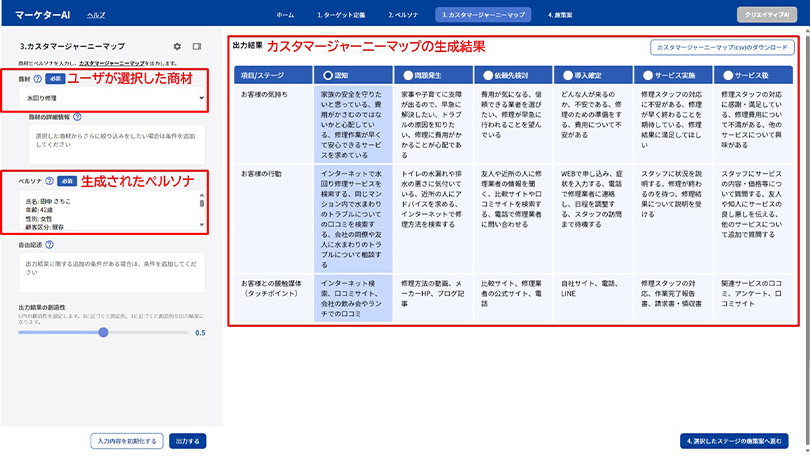 業務部門のニーズや適用効果の観点から、まずは「マーケティング施策用アプリ」を開発しました。対象業務は、顧客候補として想定されるターゲットの設定、ターゲットが具体的にどのような属性で、日々どのような行動をしているか仮説を立てるペルソナ・カスタマージャーニー設定、仮説を立てたターゲットに対して具体的にどのようなマーケティング施策が効果的か検討する施策立案です。本アプリへ対象の商材等の基礎情報を入力すると、ターゲット設定からマーケティング施策案の提示までマーケティング担当者の業務を支援出力することが可能です。