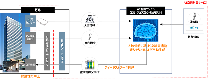 本サービスは、室温に影響を与える情報をインプットとして、AIに学習させることで、将来の室温予測に応じた制御を実現します。