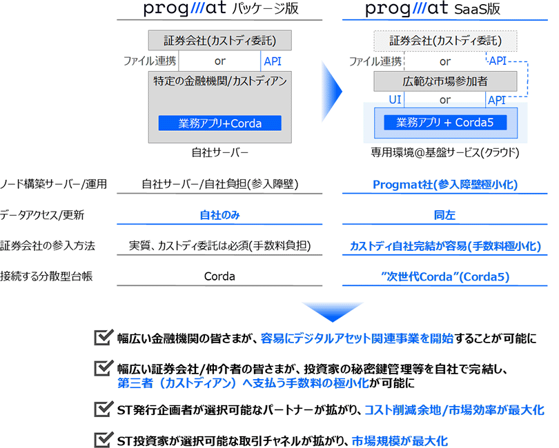 そこでProgmat社は、上記ハードルを解消するため、各市場参加者が容易に利用可能な「Progmat SaaS」の開発に従事し、本日より提供が可能となりました。これまでのパッケージ版との主な相違点と期待効果をまとめると以下のとおりです。