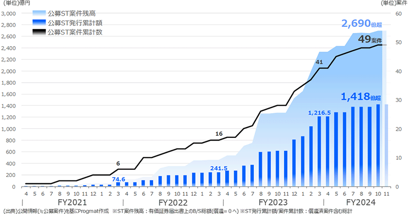 ST案件の残高総額は約2,700億円、ST発行累計額は約1,400億円/49案件(うち7件償還済)、参入証券会社数は11社(+自己募集事業者有)となっています。