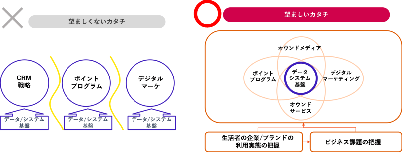 CRM・ポイントプログラム・デジタルマーケティング等の取り組みが分断された状態から、生活者の企業/ブランドの利用実態・ビジネス課題を明らかにし、課題解決に向け、データ・システム基盤を中心に据えて各取り組みを繋ぎ合わせることによる統合的なロイヤルティマネジメントを推進。
