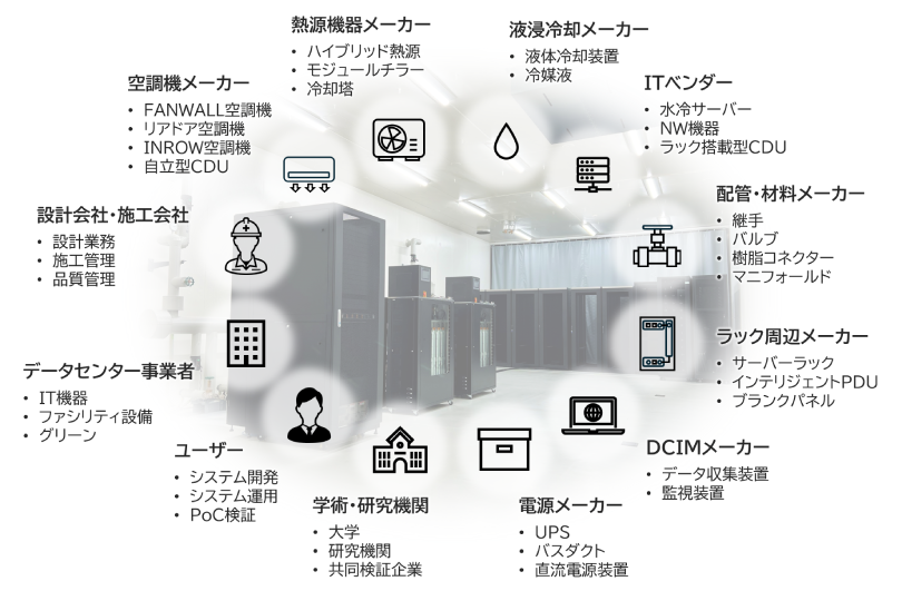 本施設は、独自に発展する液体冷却技術を活用するために、データセンター事業者や機器メーカーの他、ITベンダーや研究機関などデータセンター領域のさまざまなプレーヤーが集い、課題解決に向けた共同検証を行う場として運用を行います。