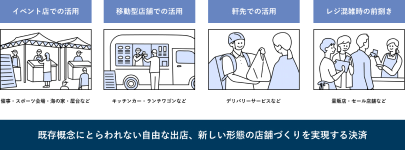 スマートフォンだけでなく、タブレットやハンディターミナルなどで支払受付が可能注3となります。これによって、接客による購入意思決定後のレジ移動を無くして顧客満足度の向上に貢献するほか、屋外やイベント店舗など多様化する販売シーンに対応します。