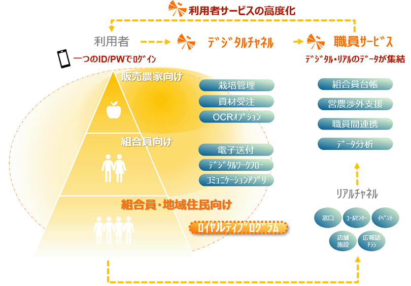 近年、JAグループは国内人口や農業就業者人口の減少・高齢化による組合員数減少など、経営環境の変化に直面しています。この解決に向け、第30回JA全国大会にて組織基盤強化戦略(JA仲間づくり戦略)を提起し、アクティブ・メンバーシップの強化を進めていますが、組合員家族や、JAとの関わりが少ない地域住民に対して、ロイヤルティを高める有効な仕組みの構築が喫緊の課題となっていました。