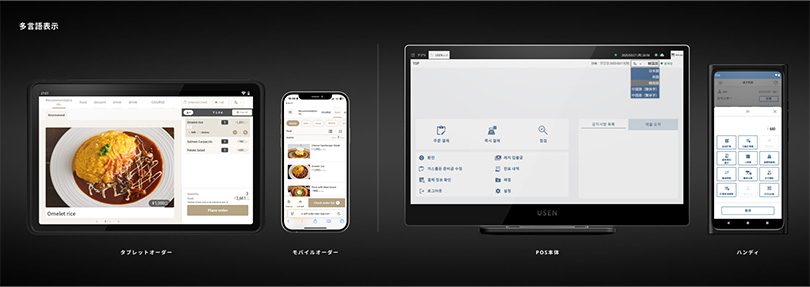 - 注文受付メニューの多言語に対応したハンディ端末に加え、会計や後続処理を行うPOS本体の操作画面も多言語対応を標準化