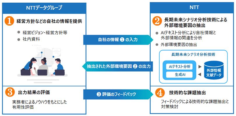 NTTデータグループは、AI技術の発展とその社会実装を推進するため、さまざまな分野での研究開発を行っており、特に、環境問題やエネルギー問題に対する解決策の提供をめざし、取り組みを強化しています。また、株式会社NTTデータ経営研究所におけるNTTデータグループのシナリオ分析支援やその他企業へのサステナビリティ関連コンサルティング実績を通じて、グループとして多くのシナリオ分析およびコンサルティングの実績を持っています。一方、NTTは、数値解析による社会変化の予測や、自然言語処理技術をもとに、長期的なシナリオ分析にAI技術を活用する研究開発を行っています。今回、各社の持つこれらのノウハウや技術を生かし、効率的で質の高いシナリオ分析を実現するために、AIを用いたシナリオ分析の共同実験を開始しました。