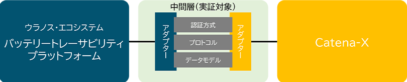 | 実証用環境の構成 | バッテリートレーサビリティプラットフォームとCatena-Xとの間に、認証方式・プロトコル・データモデルを相互に変換する中間層を設置し、双方のアーキテクチャに影響を与えず相互のデータ交換を行う環境を構築(図)。 |