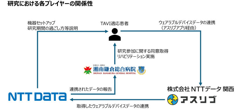 一方、NTTデータおよびNTTデータ関西は、高齢化が加速するなか、医療DXの推進という社会課題の解決に向けてウェアラブルデバイスを活用し、データの取得や流通、活用行うことで貢献できると考えています。両社の持つ医療データの臨床研究支援の実績やナレッジを生かし、湘南鎌倉総合病院とともに、健康・医療データの安全・安心な流通・活用の仕組み構築に向けたひとつの仮設を導出するため、本共同研究を開始します。