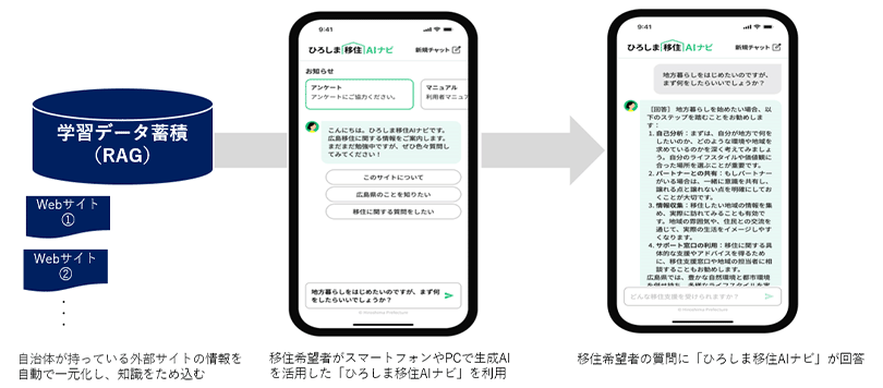 近年、地方移住の関心が高まるなか、広島県は魅力的な移住先として人気を集めており、県も移住者誘致にさまざまな施策を講じています。しかし、県に興味を持ち移住を検討する人々にとって、必要な情報を効率的に入手することは容易ではなく、また県としても窓口や電話など人的リソースでの対応には限界があります。この課題を解決し、迅速かつ効果的な情報提供を行うことで広島県への移住を促進するため、NTTデータは、広島県、NTTデータ中国と連携し、スムーズな移住相談を可能にする「ひろしま移住AIナビ」を開発しました。