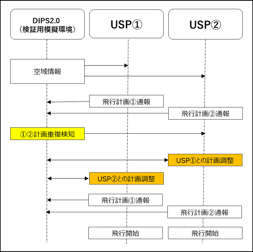 本実証により、DIPS2.0の外部システムインターフェースを模擬した検証用環境とUSPが連携した環境において、USPを利用していないドローン運航者とUSPを利用しているドローン運航者双方に対しての飛行情報や気象・空域情報などの情報共有、USP間での飛行計画調整の実現性を確認することができました。実施内容は以下の通りです。