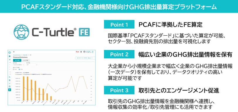 C-Turtle FEは、C-Turtle上で、金融機関における国際的基準「PCAF注6スタンダード」に準拠したファイナンスド・エミッションの可視化と削減を支援するサービスです。本サービスを利用することで、投融資先の一次データを活用し、投融資先におけるGHG排出量の削減努力を反映したデータクオリティの高いファイナンスド・エミッション算定が可能となります。