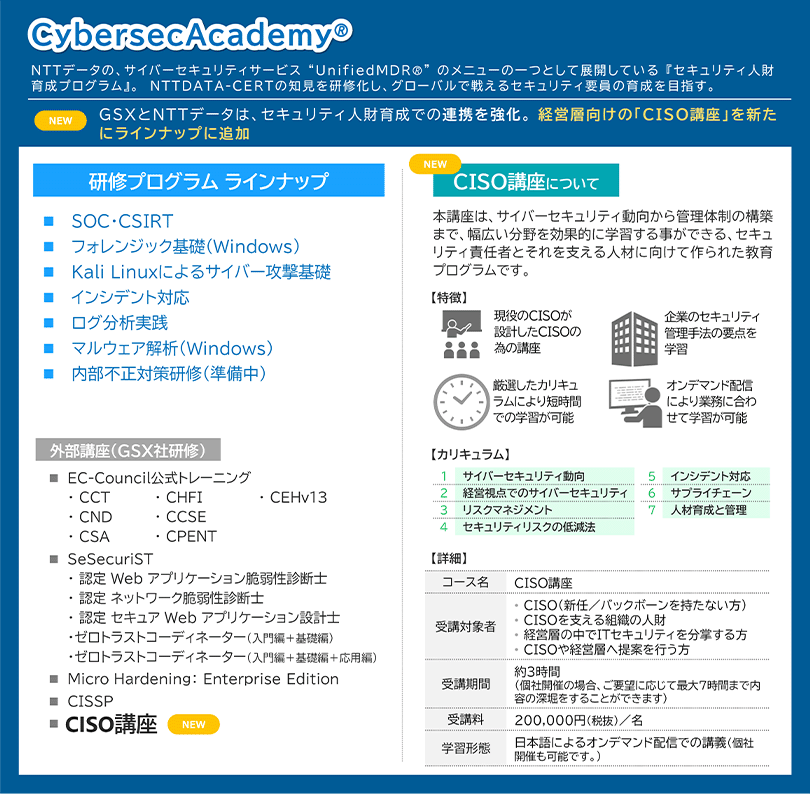 株式会社NTTデータ(以下、NTTデータ)は、企業のセキュリティ人財を育成する研修プログラム「CybersecAcademy®(読み:サイバーセックアカデミー)」注1において、2025年5月22日より経営者層を対象とした「CISO(最高情報セキュリティ責任者)講座」の提供を開始します。「CISO講座」は、グローバルセキュリティエキスパート株式会社(以下:GSX)が開発・提供しており、経営者自身のセキュリティ対応力を高め、平時のセキュリティ対策からサイバー攻撃状況下における適切な状況把握と判断を行える人財を育成するプログラムです。