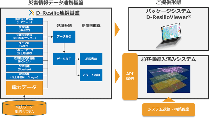 D-Resilio連携基盤のサービスとして提供するため、災害情報収集パッケージサービス「D-Resilio Viewer®」注4を通じて簡単に利用できるほか、API連携により他の防災システムと連携するなど、お客さまの環境にあわせたサービス提供が可能です。
