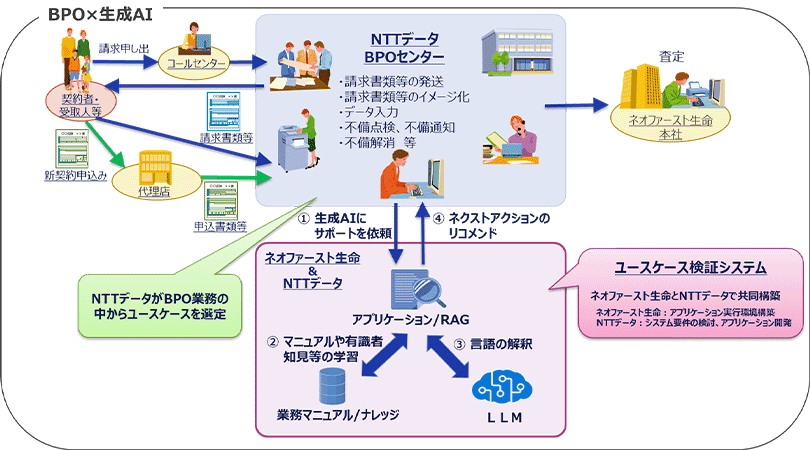 株式会社NTTデータ(代表取締役社長:佐々木 裕、以下:NTTデータ)は、ネオファースト生命保険株式会社(代表取締役社長:上原 高志、以下:ネオファースト生命)よりBPO業務として受託している保険契約事務(以下、BPO業務)において、事務効率化を目的とした生成AIのトライアル利用(以下、本トライアル)を2025年6月より開始します。